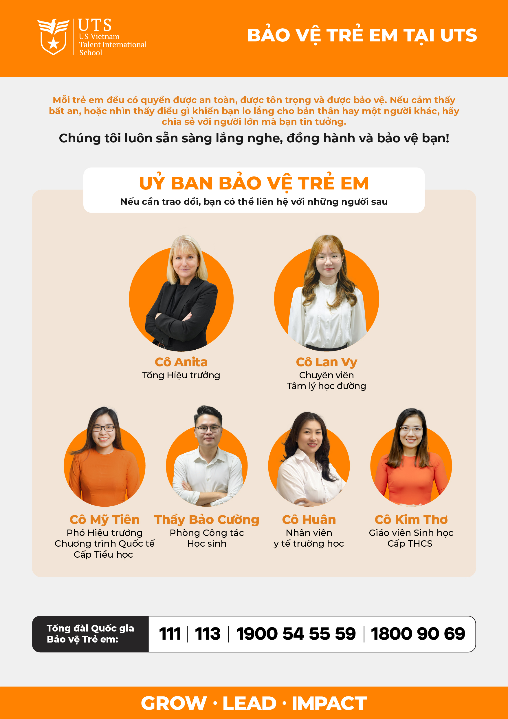 Chính sách bảo vệ trẻ em tại UTS được thiết lập nhằm đảm bảo an toàn và phát triển toàn diện cho học sinh. Chính sách tập trung vào việc bảo vệ trẻ khỏi ngược đãi, ngăn chặn suy giảm sức khỏe và đảm bảo môi trường phát triển phù hợp. Hiệu quả của chính sách đòi hỏi sự phối hợp giữa các giáo viên, nhân viên và chuyên trách bảo vệ an toàn trẻ em. Phòng ngừa là biện pháp chính nhưng khi cần thiết, nhà trường sẽ phối hợp với gia đình và cơ quan chức năng để xử lý các trường hợp xâm hại.